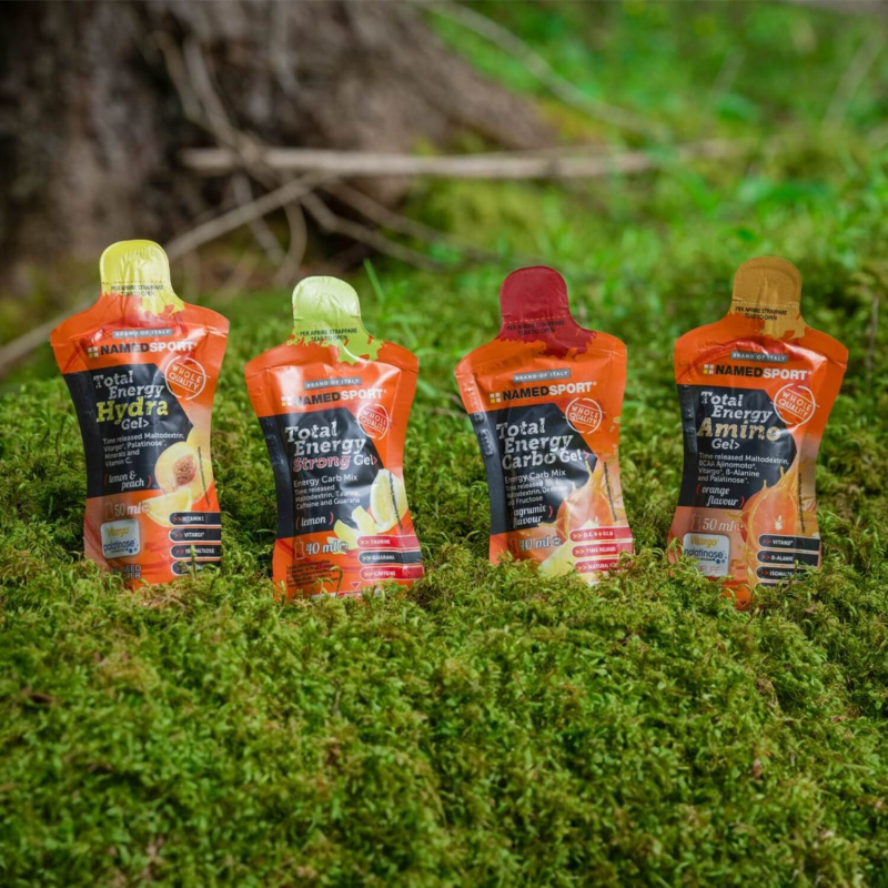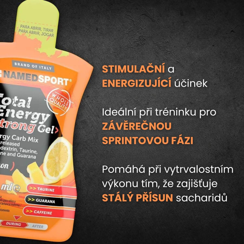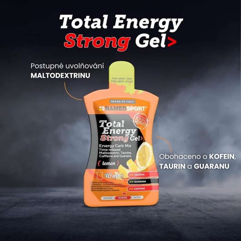 TOTAL ENERGY STRONG GEL – potravina pro osoby při zvýšeném tělesném výkonu. Energetický gel na bázi maltodextrinů s různou rychlostí asimilace (rozdílný DE), dextrózou a fruktózou, obohacený kofeinem, taurinem a guaranou.