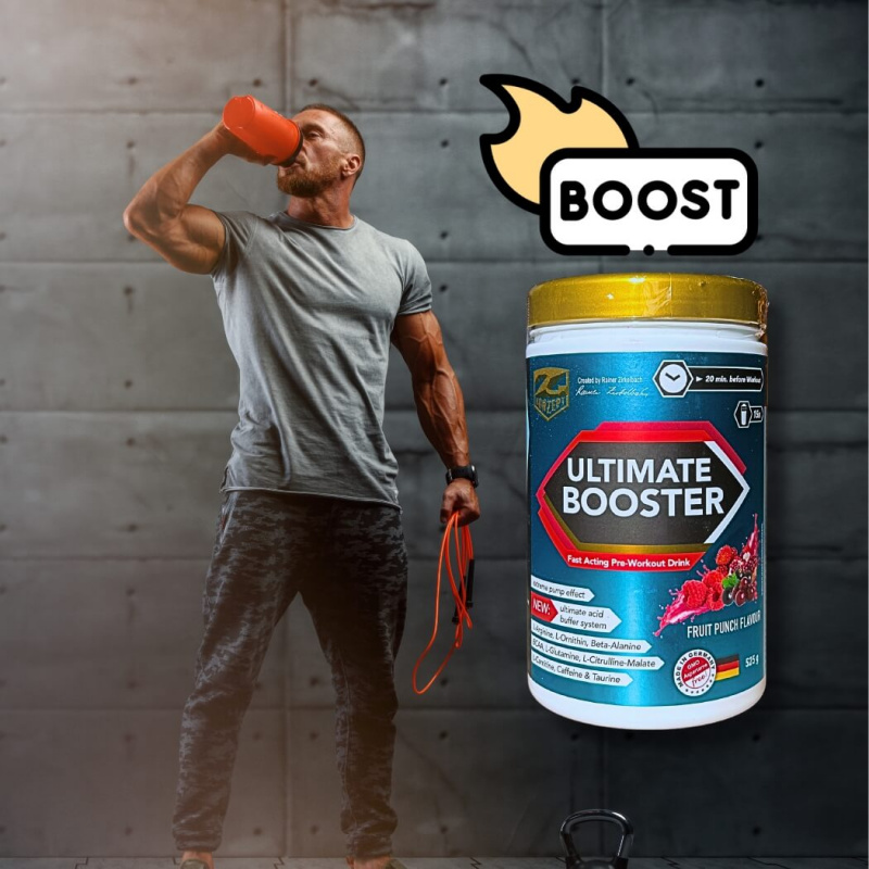 Ultimate Booster kombinuje všechny důležité ingredience pro delší a tvrdší trénink. Cílem je stimulace energie, zvýšení cirkulace a snížení tvorby kyseliny mléčné, která brání intenzivnímu výkonu.